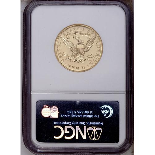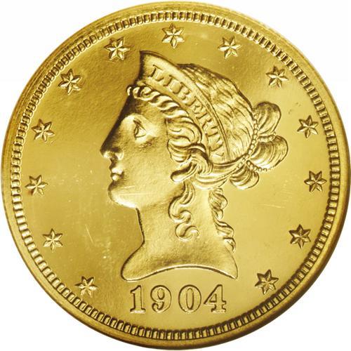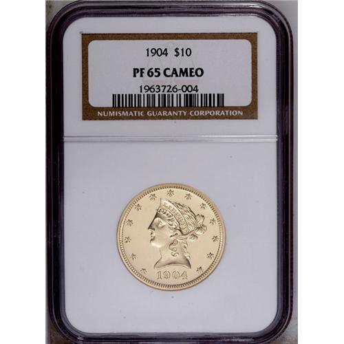 <B>1904 $10 PR65 Cameo NGC.</B></I> The <I>Guide Book</B></I> reports a proof mintage of 108 pieces, but given its high face value in the years prior to the 1933 gold recall, many proof examples of the date were likely spent. NGC (1/06) has certified a total of 29 pieces in all grades, with resubmissions presumably accounting for a portion of the population. This is the first proof 1904 eagle to appear in a Heritage auction since the NGC PR66 Trompeter specimen was hammered down for $55,200 nearly six years ago, and the first ever 1904 with a Cameo designation. The present razor-sharp Gem displays rich lemon-gold color, and only a single faint hairline is detected, from above star 3 to the chin. A die line within the curl below the ear, located near the top of the neck, serves as a diagnostic for this rare proof issue.