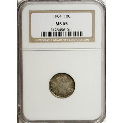 <B>1904 10C MS65 NGC.</B></I> This lustrous and exactingly struck Gem has pearl-gray centers and sparkling sea-green borders. A carefully preserved representative of this conditionally challenging issue. Census: 8 in 65, 7 finer (8/07).<BR><BR><B>Coin Engraver:</B> Charles E. Barber<BR><BR><b>Shipping:</b> Coins & Currency (<a target="_blank" href="http://www.heritageauctions.com/common/shipping.php">view shipping information</a>)