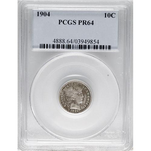 <B>1904 10C PR64 PCGS.</B></I> PCGS Population (66/52). NGC Census: (104/148). Mintage: 670. Numismedia Wsl. Price for NGC/PCGS coin in PR64: $530. (#4888)<BR><BR><b>Shipping:</b> Coins & Currency (<a target="_blank" href="http://www.heritageauctions.com/common/shipping.php">view shipping information</a>)