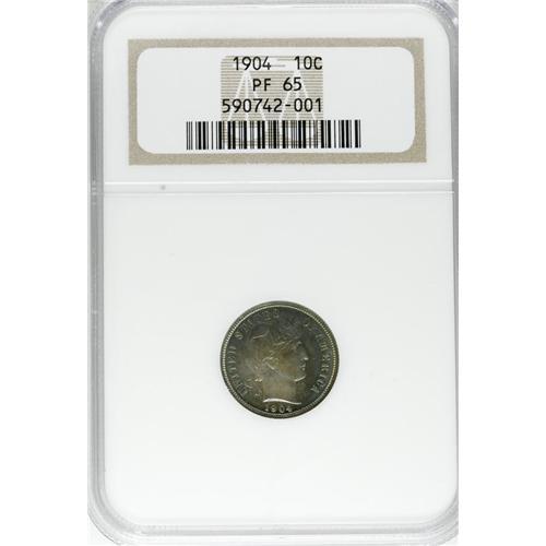 <B>1904 10C PR65 NGC.</B></I> Deep sea-green and violet toning adorns the surfaces of this Gem proof. Fully struck and free of hairlines, the piece shows a few tiny contact marks on Liberty's face and neck that are too trivial to limit the grade. Census: 39 in 65, 35 finer (4/07).<BR><BR><b>Shipping:</b> Coins & Currency (<a target="_blank" href="http://www.heritageauctions.com/common/shipping.php">view shipping information</a>)