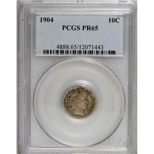 <B>1904 10C PR65 PCGS.</B></I> Dappled silver-gray, plum, and rose patina graces the obverse, while the reverse has the first color in the center and the other two at the margins. Mildly reflective beneath the patina and free of significant hairlines, a lovely 20th century Barber proof. Population: 27 in 65, 26 finer (8/07).<BR><BR><B>Coin Engraver:</B> Charles E. Barber<BR><BR><b>Shipping:</b> Coins & Currency (<a target="_blank" href="http://www.heritageauctions.com/common/shipping.php">view shipping information</a>)