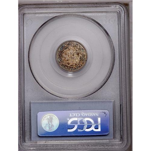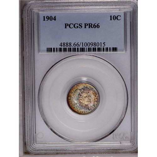 <B>1904<10C> PR66 PCGS.</B></I> A colorfully toned Premium Gem example, the obverse is overlaid with a blend of mint-green, sky-blue, and rich sunset-red color at the border. The reverse is somewhat lighter with cobalt-blue and mottled russet patina. A squiggly lintmark is noted on Liberty's chin. Population: 16 in 66, 9 finer (4/06).