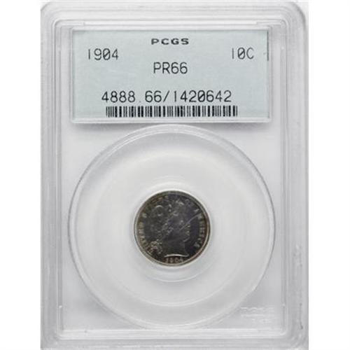 <B>1904 10C PR66 PCGS.</B></I> Aquamarine, chestnut-gold, and ruby-red adorn this splendid Premium Gem. The old green label holder has its share of small marks, none of which affect the preservation of the essentially pristine proof dime securely nestled inside. Population: 17 in 66, 9 finer (10/07).<BR><I>From The Chandler Collection.</B></I><BR><BR><B>Coin Engraver:</B> Charles E. Barber<BR><BR><b>Shipping:</b> Coins & Currency (<a target="_blank" href="http://www.heritageauctions.com/common/shipping.php">view shipping information</a>)