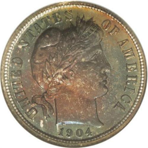<B>1904 10C PR67 NGC.</B></I> Beautiful ruby-red, apple-green, and gold consume the obverse. The reverse is fully toned as well, in aquamarine shades. Sharply struck save for a couple of the uppermost cereal grains. Only 670 proofs were struck, few of which have survived in such exemplary quality. Census: 8 in 67, 1 finer (8/07).<BR><BR><B>Coin Engraver:</B> Charles E. Barber<BR><BR><b>Shipping:</b> Coins & Currency (<a target="_blank" href="http://www.heritageauctions.com/common/shipping.php">view shipping information</a>)
