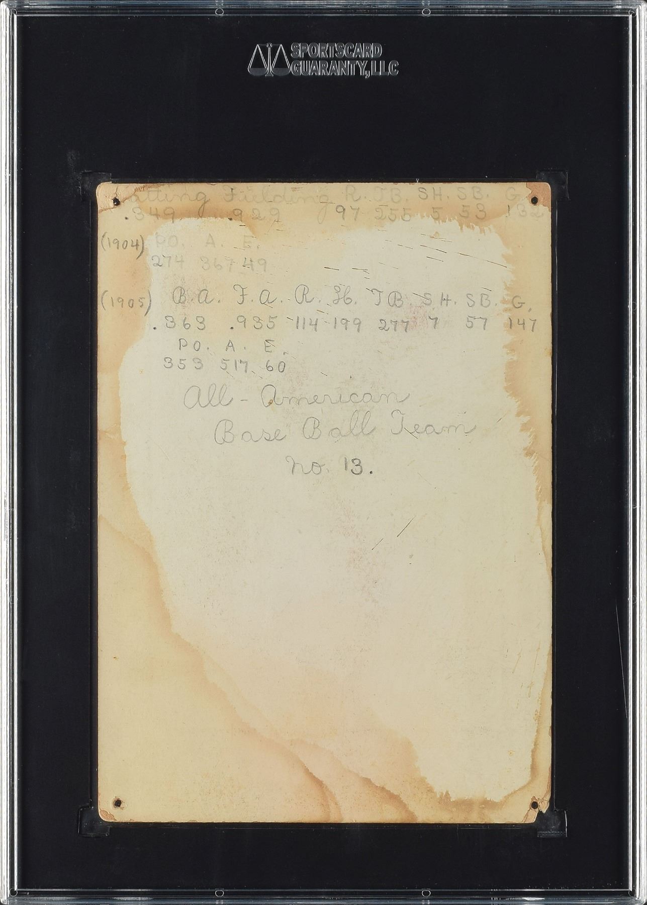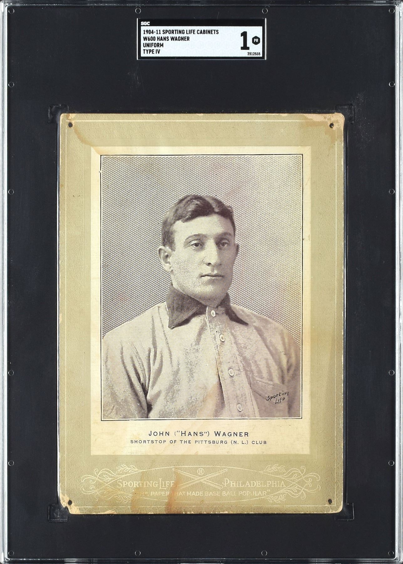 Sporting Life offered many of the players in two poses, street clothes or uniform, and among collectors the uniform cards command a premium. But the jumbo twin of the T206 "Holy Grail" Wagner is arguably the most desirable if all the W600 Sporting Life Cabinets. The offered card is on a Type 4 mount and is one of two Wagner's graded by SGC. While there is significant wear to the mount garnering the appropriate SGC 1 grade, the famed portrait image is dominant, and obviously the essence of any baseball card, but never more so than with this iconic piece.