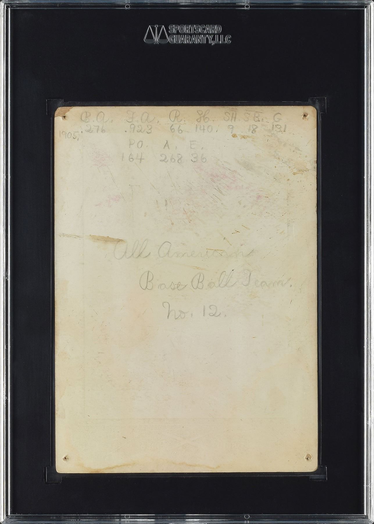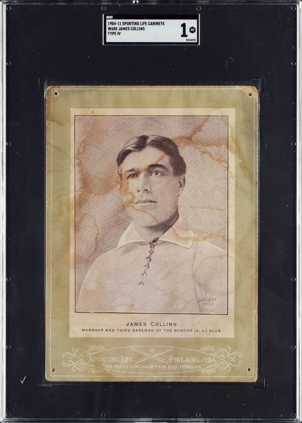 Only a handful of each Sporting Life cabinet are known to exist, and is graded and encapsulated by SGC. While the image of Collins is still crisp, there is significant staining on the image and surrounding mount. Other issues include corner wear, creasing and a large amount of statistics written in pencil on the reverse.