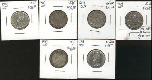 1904, 1907, 1909, 1919 (2), 1929. Lot of 6 coins. Grades vary from VG-8 to EF-45.