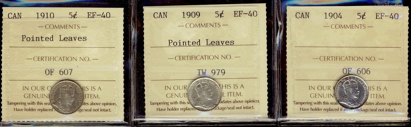 1904, 1909 Ptd Lvs, 1910 Ptd Lvs, 5¢ all ICCS EF40, Lot of 3 coins,