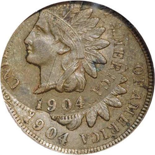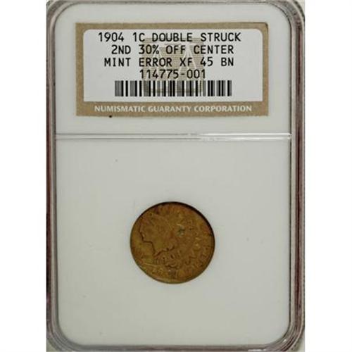 <B>1904 1C Indian Cent--Double Struck, Second Strike 30% Off Center--XF45 NGC.</B></I> The second strike is widely off center toward 10:30, at 10 o'clock relative to the first strike. The dates from both strikes are clear and complete. The obverse is golden-brown, and the reverse has slightly deeper steel-gray toning.<BR><BR><B>Coin Engraver:</B> James B. Longacre<BR><BR><b>Shipping:</b> Coins & Currency (<a target="_blank" href="http://www.heritageauctions.com/common/shipping.php">view shipping information</a>)