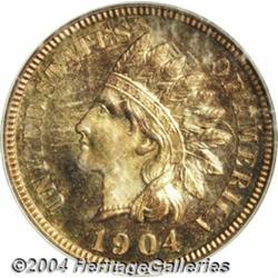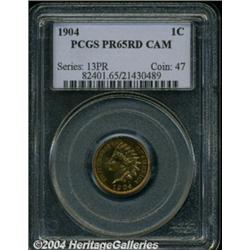 <B>1904<1C> PR 65 Red Cameo PCGS.</B></I> This particular coin lacks the fine die finishing lines seen on many 1904 proofs, and while many coins possess these lines and they should not limit a coin's grade, for many collectors they do limit a coin's desirability. The fields are deeply mirrored and the margin around the obverse is cherry-red. The reverse, on the other hand, has a lovely orange-red, cherry-red, and lime-green iridescence. For quite some time this issue was unknown with a cameo effect, but there is significant field-to-device contrast noted on both sides of this piece. A very attractive example of this common proof Indian cent and very scarce with cameo contrast. Population: 2 in 65, 2 finer (7/04). <BR><BR><B>Important notice:</B> Heritage usually auctions material at the rate of 200-250 lots per hour. On some occasions eBay Live bid software or the Internet may not be able to keep up with the pace of the auction. We recommend placing a realistic absentee bid now as insurance to avoid disappointment. Occasionally the auctioneer may eliminate or reject an eBay Live bid, and the auctioneer may also reopen a lot after the close of the eBay live bidding (usually because we missed an audience bid), and may reject your bid even if it shows you as the winning bidder. By bidding via eBay Live, you agree that Heritage may award the lot to another bidder at its sole discretion under the circumstances described above or any other reasonable circumstances. Since eBay bids are not shown to us until we open the lot on the floor, we treat those bids just like floor bids. In most cases the floor responds before the eBay bid is presented to us, due to Internet lag time, so for consistency we have made it a policy that floor bids are always considered first over tie eBay live bids. Also please note that all Heritage lots purchased through eBay Live carry a 20% Buyer's Premium. Please make sure you read the Terms and Conditions before you bid. </span></font></tr></table></td></tr></table>