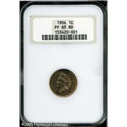 <B>1904 1C PR65 Red NGC.</B></I> Several faint handling marks are seen with the aid of a loupe and the mirrors are highly reflective. Small amounts of reddish patina are seen on both sides and increase the appeal of this proof Gem. Housed in an older NGC holder. Lot:5354