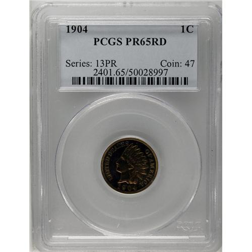 <B>1904<1C> PR65 Red PCGS.</B></I> Bright apricot and lime tints adorn reflective fields and well-struck devices. Two spots are noted, one below the zero in the date and another concealed within the shield. Population: 20 in 65, 6 finer (6/06).<BR><I>From The Empire Tree Collection, Part Two.</B></I>