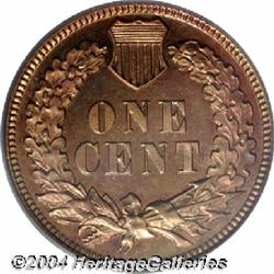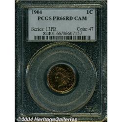 <B>1904<1C> PR66 Red Cameo PCGS.</B></I> As an issue, there is nothing extraordinary about the 1904 proof Indian Cent. Its original mintage of 1,817 pieces is consistent with the other 20th century issues in this series, and average quality representatives are readily available. However, not only are Gem or better, full red examples surprisingly difficult, but the mint took no particular care in striking proofs with any kind of contrast. The sparkling proof offered here is truly an anomaly for the issue. Both sides exhibit bright, variegated, golden-red and crimson color and contrast that can only be described as totally unexpected for a 1904. Population: 3 in 66 Cameo, 0 finer (9/04). <BR><BR><B>Important notice:</B> Heritage usually auctions material at the rate of 200-250 lots per hour. On some occasions eBay Live bid software or the Internet may not be able to keep up with the pace of the auction. We recommend placing a realistic absentee bid now as insurance to avoid disappointment. Occasionally the auctioneer may eliminate or reject an eBay Live bid, and the auctioneer may also reopen a lot after the close of the eBay live bidding (usually because we missed an audience bid), and may reject your bid even if it shows you as the winning bidder. By bidding via eBay Live, you agree that Heritage may award the lot to another bidder at its sole discretion under the circumstances described above or any other reasonable circumstances. Since eBay bids are not shown to us until we open the lot on the floor, we treat those bids just like floor bids. In most cases the floor responds before the eBay bid is presented to us, due to Internet lag time, so for consistency we have made it a policy that floor bids are always considered first over tie eBay live bids. Also please note that all Heritage lots purchased through eBay Live carry a 20% Buyer's Premium. Please make sure you read the Terms and Conditions before you bid.