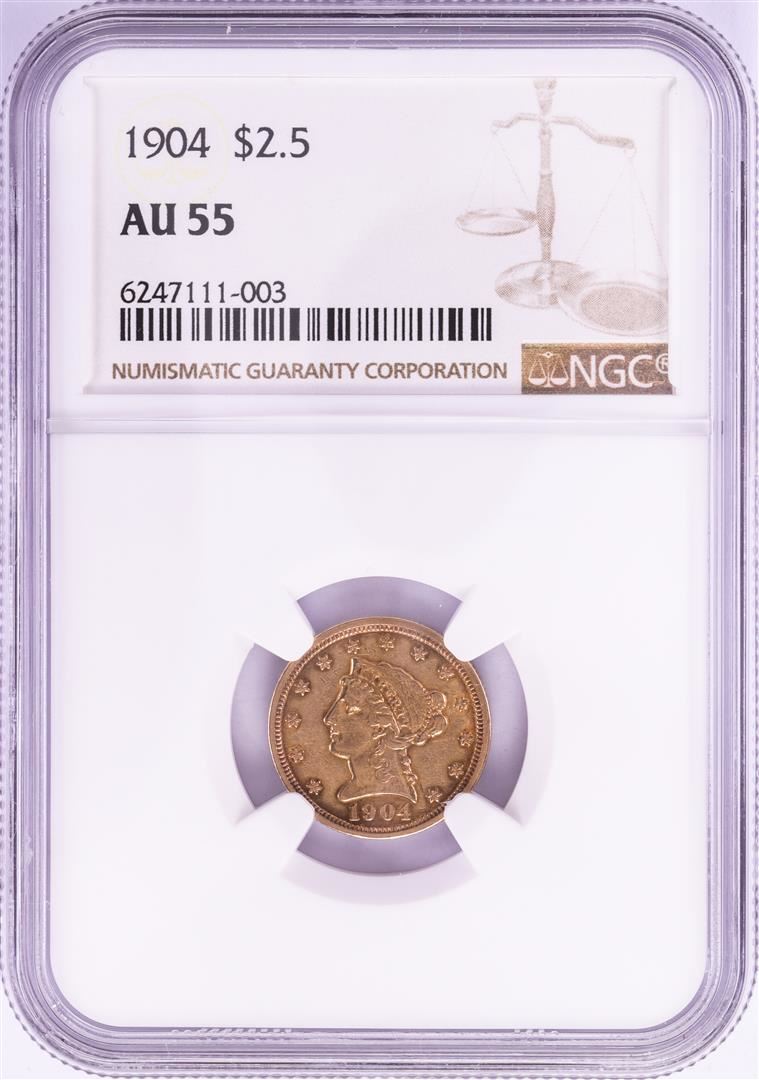 One 1904 $2 1/2 Liberty Head Quarter Eagle Gold Coin NGC AU55. NGC Certified.