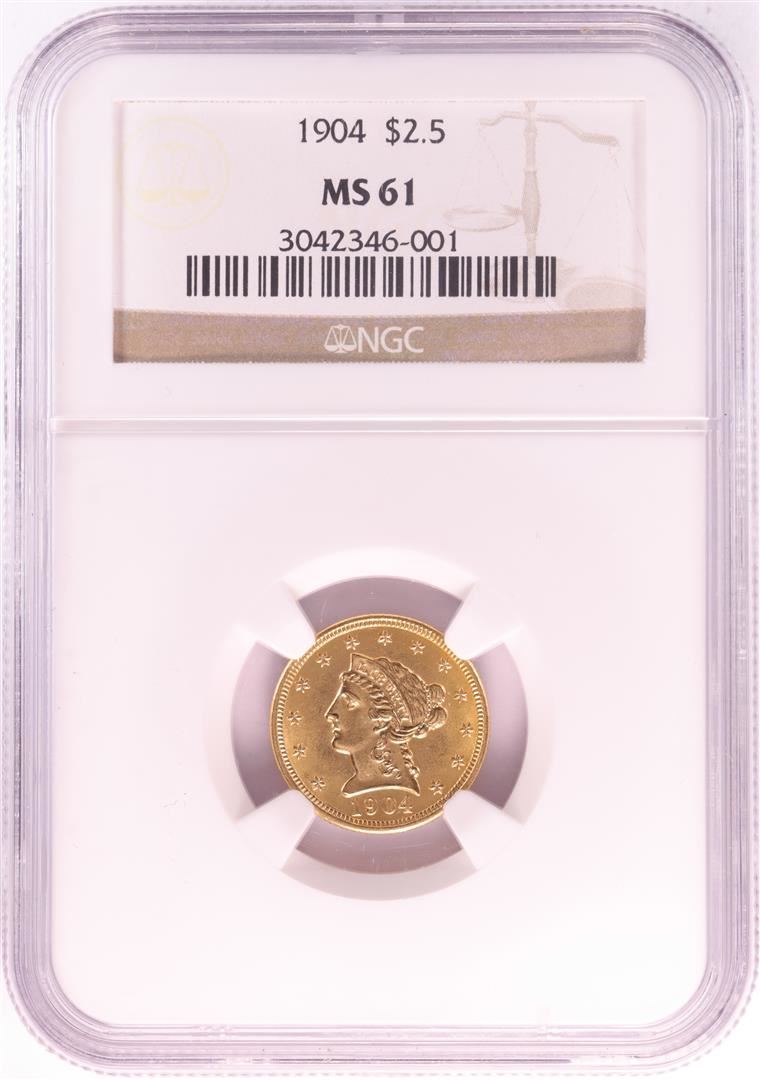 One 1904 $2 1/2 Liberty Head Quarter Eagle Gold Coin NGC MS61. NGC Certified.