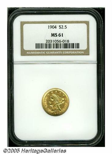 <B>1904<$2 1/2> MS61 NGC.</B></I> Attractive brass-gold patina overlays lustrous surfaces that exhibit sharply struck design features, except for softness in the hair over Liberty's ear. A diagonal linear abrasion is noted on the top part of the shield, and wispy handling marks occur in the fields.