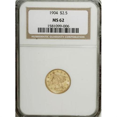 <B>1904 $2 1/2 MS62 NGC.</B></I> NGC Census: (736/1933). PCGS Population (712/2144). Mintage: 160,700. Numismedia Wsl. Price for NGC/PCGS coin in MS62: $485. (#7856)<BR><BR><B>Coin Engraver:</B> Christian Gobrecht<BR><BR><b>Shipping:</b> Coins & Currency (<a target="_blank" href="http://www.heritageauctions.com/common/shipping.php">view shipping information</a>)