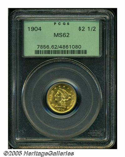 <B>1904<$2 1/2> MS62 PCGS.</B></I> An intricately struck and fully lustrous type coin. Luminous honey color and clean surfaces ensure the eye appeal. Faint repunching is noted on the base of the 1 in the date.