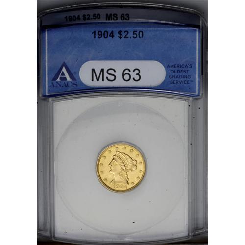 1904 $2 1/2 MS63 ANACS. Well struck and satiny, with v