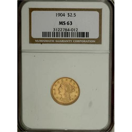 <B>1904 $2 1/2 MS63 NGC.</B></I> NGC Census: (682/1331). PCGS Population (982/1245). Mintage: 160,700. Numismedia Wsl. Price for NGC/PCGS coin in MS63: $1,140. (#7856)<BR><BR><B>Coin Engraver:</B> Christian Gobrecht<BR><BR><b>Shipping:</b> Coins & Currency (<a target="_blank" href="http://www.heritageauctions.com/common/shipping.php">view shipping information</a>)