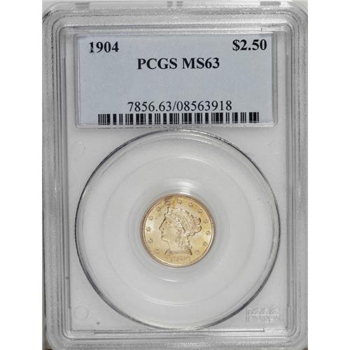 1904 $2 1/2 MS63 PCGS. The lustrous surfaces are yello