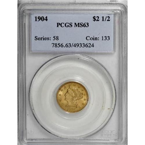 <B>1904 $2 1/2 MS63 PCGS.</B></I> PCGS Population (955/1164). NGC Census: (661/1264). Mintage: 160,700. Numismedia Wsl. Price for NGC/PCGS coin in MS63: $730. (#7856)<BR><BR><B>Coin Engraver:</B> Christian Gobrecht<BR><BR><b>Shipping:</b> Coins & Currency (<a target="_blank" href="http://www.heritageauctions.com/common/shipping.php">view shipping information</a>)