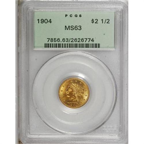 <B>1904 $2 1/2 MS63 PCGS.</B></I> . PCGS Population (977/1224). NGC Census: (680/1321). Mintage: 160,700. Numismedia Wsl. Price for NGC/PCGS coin in MS63: $1,150. (#7856)<BR><BR><B>Coin Engraver:</B> Christian Gobrecht<BR><BR><b>Shipping:</b> Coins & Currency (<a target="_blank" href="http://www.heritageauctions.com/common/shipping.php">view shipping information</a>)