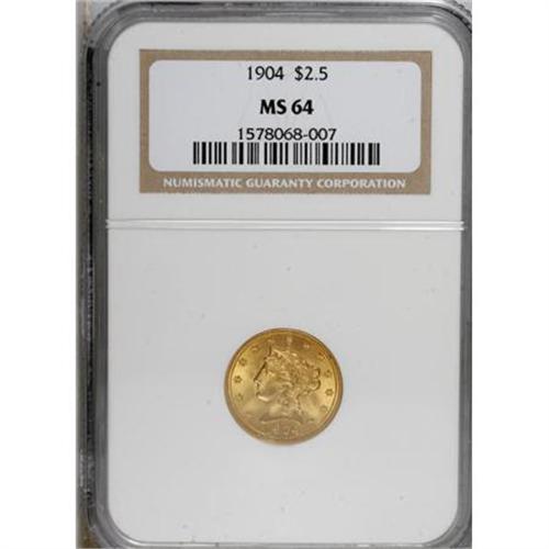 <B>1904 $2 1/2 MS64 NGC.</B></I> A relatively large number of 1904 quarter eagles have survived in higher grades of Mint State, including MS64, making this issue a good choice for type purposes. This example is satiny and smooth, with light greenish-peach coloration and sharply struck design elements. Surface marks are minimal for the grade. <BR><BR><B>Coin Engraver:</B> Christian Gobrecht<BR><BR><b>Shipping:</b> Coins & Currency (<a target="_blank" href="http://www.heritageauctions.com/common/shipping.php">view shipping information</a>)