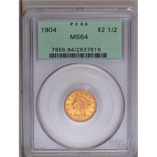 <B>1904<$2 1/2> MS64 PCGS.</B></I> Choice and lustrous with honey-gold fields and straw-gold devices. The surfaces are extremely clean for the grade. Housed in a green label holder.
