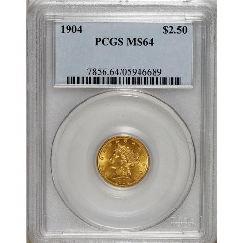 <B>1904 $2 1/2 MS64 PCGS.</B></I> Strongly lustrous with crisp detail overall and only a handful of scattered marks. Shades of yellow-gold and orange intermingle on both sides. A Choice choice for the type collector.<BR><BR><b>Shipping:</b> Coins & Currency (<a target="_blank" href="http://www.heritageauctions.com/common/shipping.php">view shipping information</a>)
