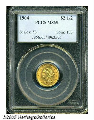 <B>1904<$2 1/2> MS65 PCGS.</B></I> All of the design elements are sharply struck, with pretty greenish-gold patina over intensely lustrous surfaces. A couple of trivial, unimportant marks are noted on Liberty's cheek and in the left (facing) obverse fields.