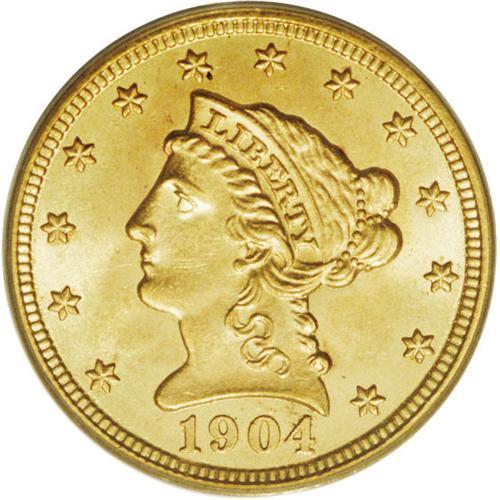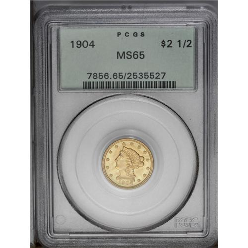 <B>1904 $2 1/2 MS65 PCGS.</B></I> Highly lustrous surfaces with a mix of apricot-gold and mint-green patination enliven both sides of this lovely Gem quarter eagle. All of the design features are well brought up, and just a few trivial handling marks preclude an even higher grade. Housed in a green label holder.<BR><BR><b>Shipping:</b> Coin/Currency (<a target="_blank" href="http://www.heritageauctions.com/common/shipping.php">view shipping information</a>)