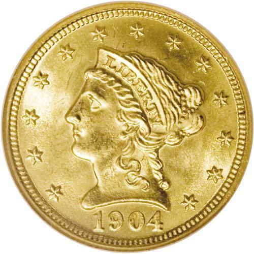 1904 $2 1/2 MS66 NGC. A glittering, lustrous green-gol