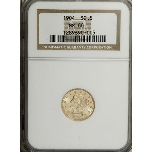 <B>1904 $2 1/2 MS66 NGC.</B></I> A glittering, lustrous green-gold jewel of this available issue, the most common of the type. Unlike many Mint State examples, however, this piece shows no copper stains or other impairments. A perfect acquisition for a superb high grade gold type set.<BR><BR><b>Shipping:</b> Coin/Currency (<a target="_blank" href="http://www.heritageauctions.com/common/shipping.php">view shipping information</a>)