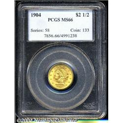 <B>1904<$2 1/2> MS66 PCGS.</B></I> Astonishing quality in a Coronet Quarter Eagle. The luster is superb, swirling around the surfaces as it is angled beneath a light, and showing lovely mint-green patina over much of the surface area. It would be hard to improve on this coin. <BR><BR><B>Important notice:</B> Heritage usually auctions material at the rate of 200-250 lots per hour. On some occasions eBay Live bid software or the Internet may not be able to keep up with the pace of the auction. We recommend placing a realistic absentee bid now as insurance to avoid disappointment. Occasionally the auctioneer may eliminate or reject an eBay Live bid, and the auctioneer may also reopen a lot after the close of the eBay live bidding (usually because we missed an audience bid), and may reject your bid even if it shows you as the winning bidder. By bidding via eBay Live, you agree that Heritage may award the lot to another bidder at its sole discretion under the circumstances described above or any other reasonable circumstances. Since eBay bids are not shown to us until we open the lot on the floor, we treat those bids just like floor bids. In most cases the floor responds before the eBay bid is presented to us, due to Internet lag time, so for consistency we have made it a policy that floor bids are always considered first over tie eBay live bids. Also please note that all Heritage lots purchased through eBay Live carry a 20% Buyer's Premium. Please make sure you read the Terms and Conditions before you bid.