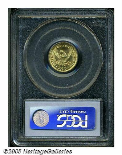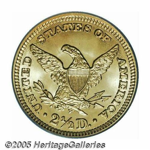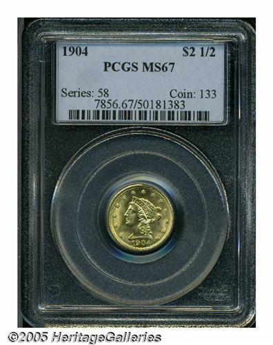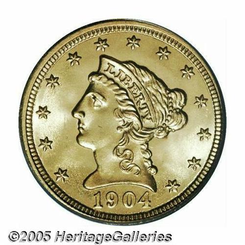 <B>1904<$2 1/2> MS67 PCGS.</B></I> Brilliant and sharply struck. The devices are frosty, and the luster in the fields varies from satiny to frosty. Although the 1904 is readily available in Uncirculated condition, that statement certainly doesn't apply to examples at the MS67 level; the rarity of the 1904 in MS67 condition is well attested by the PCGS population data. Indeed it's remarkable that a piece struck for circulation nearly a century ago, could come down to the present time virtually unscathed. A prize for the numismatic perfectionist. Population: 28 in 67, 1 finer (5/05).
