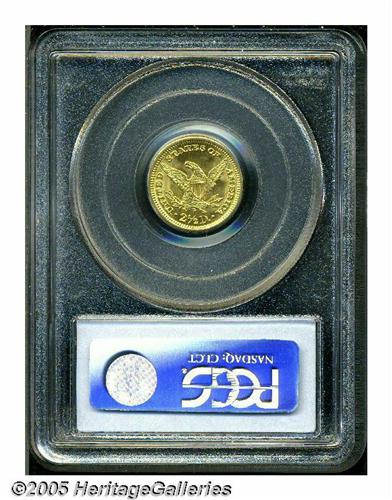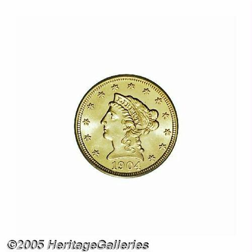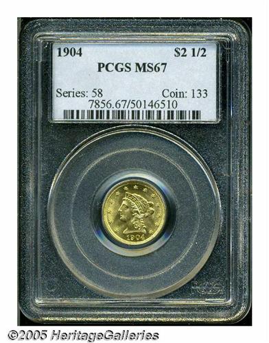 <B>1904<$2 1/2> MS67 PCGS.</B></I> Struck in honey-gold, this Liberty Quarter Eagle is truly magnificent with razor sharp definition in the central and peripheral devices. The surfaces, as one would expect, are immaculate and show vibrant, scintillating original luster and surfaces that are seemingly pristine. Population: 28 in 67, 1 finer (5/05).
