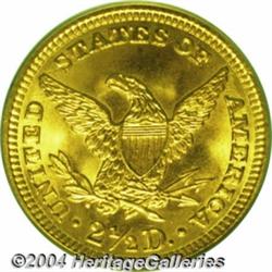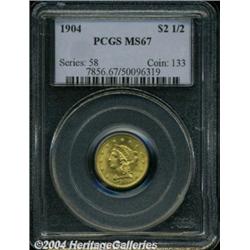 <B>1904<$2 1/2> MS67 PCGS.</B></I> A needle-sharp Superb Gem that has booming cartwheel luster and splendid preservation. Hints of prooflike surface, as made, are noted near Liberty's hair-bun. This lovely canary-gold representative would be an imposing addition to the finest quality gold type set. Population: 25 in 67, 1 finer (6/04). <BR><BR><B>Important notice:</B> Heritage usually auctions material at the rate of 200-250 lots per hour. On some occasions eBay Live bid software or the Internet may not be able to keep up with the pace of the auction. We recommend placing a realistic absentee bid now as insurance to avoid disappointment. Occasionally the auctioneer may eliminate or reject an eBay Live bid, and the auctioneer may also reopen a lot after the close of the eBay live bidding (usually because we missed an audience bid), and may reject your bid even if it shows you as the winning bidder. By bidding via eBay Live, you agree that Heritage may award the lot to another bidder at its sole discretion under the circumstances described above or any other reasonable circumstances. Since eBay bids are not shown to us until we open the lot on the floor, we treat those bids just like floor bids. In most cases the floor responds before the eBay bid is presented to us, due to Internet lag time, so for consistency we have made it a policy that floor bids are always considered first over tie eBay live bids. Also please note that all Heritage lots purchased through eBay Live carry a 20% Buyer's Premium. Please make sure you read the Terms and Conditions before you bid. </span></font></tr></table></td></tr></table>