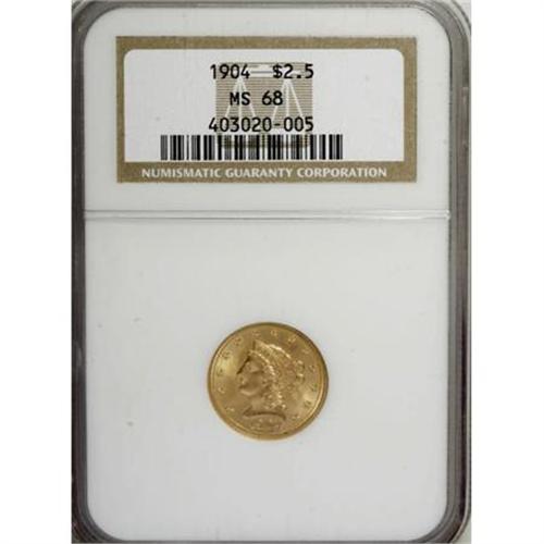<B>1904 $2 1/2 MS68 NGC.</B></I> A pristine Superb Gem example with shimmering green-golden surfaces that exhibit no noticeable abrasions or other imperfections. This lovely quarter eagle is fully struck and shows several areas of noticeable metal flow within the peripheral devices on each side. This often over-critical cataloger can see no reason at all to disagree with the assigned MS68 grade. If you are a collector who is looking for a fabulous Liberty quarter eagle to include in a top-notch gold type set, look no further. Census: 4 in 68, 0 finer (12/07).<BR><BR><B>Coin Engraver:</B> Christian Gobrecht<BR><BR><b>Shipping:</b> Coins & Currency (<a target="_blank" href="http://www.heritageauctions.com/common/shipping.php">view shipping information</a>)
