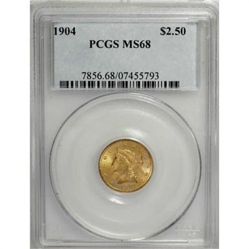 <B>1904 $2 1/2 MS68 PCGS.</B></I> In the broader context of quarter eagles, the 1904 is not an issue that draws attention to itself. While it is a readily available issue through most grades, including better Mint State designations, the 1904 is rarely selected by type collectors due to the larger populations of subsequent Liberty quarter eagle issues. In the stratospheric Superb Gem realm, however, even the seemingly plentiful 1904 becomes a condition rarity.<BR> The Registry collector should note that this is the <I>only</B></I> MS68 representative certified by PCGS, with none finer (12/07). The strike is as bold as one could possibly imagine, with exquisite definition on the central and peripheral elements alike. Vibrant luster graces the lively and immaculate yellow-gold and apricot surfaces. Close examination under magnification merely reinforces one's impression of virtual perfection.<BR><BR><B>Coin Engraver:</B> Christian Gobrecht<BR><BR><b>Shipping:</b> Coins & Currency (<a target="_blank" href="http://www.heritageauctions.com/common/shipping.php">view shipping information</a>)