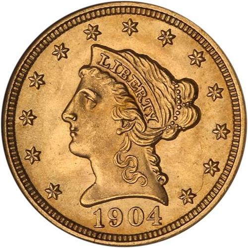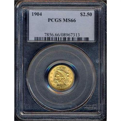 <b>1904 $2.50 Liberty. PCGS graded MS66.</b> PCGS Pop: 123. The color is a rich blend of orange-gold and honey-gold shades. The surfaces fresh, beautiful, and gleaming without the heavy bagmarks often found. A gem <b>(PCGS # 7856)</b> <i>