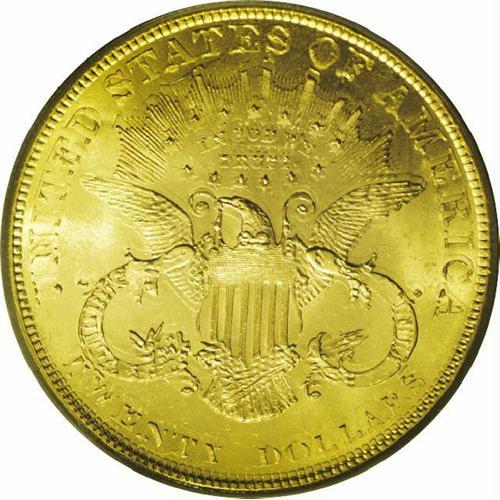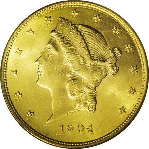 <B>1904<$20> Double Eagle--Double Struck in Collar--MS63 PCGS.</B></I> This lustrous double eagle remained in the collar after its initial strike. The piece rotated counterclockwise a degree or two, then was struck a second time. The rotated double strike causes shelf-like outlines near design elements. Less abraded than customary for the MS63 grade. Mint errors of consequence are rare on U.S. gold coins.