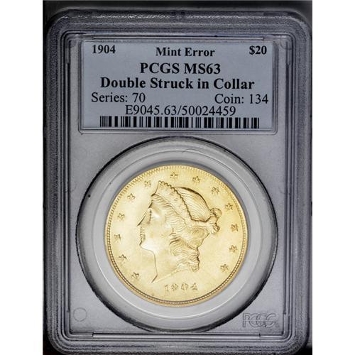 1904 $20 --Double Struck in Collar--MS63 PCGS. This lus 1904[$20] Double Eagle--Double Struck in Col