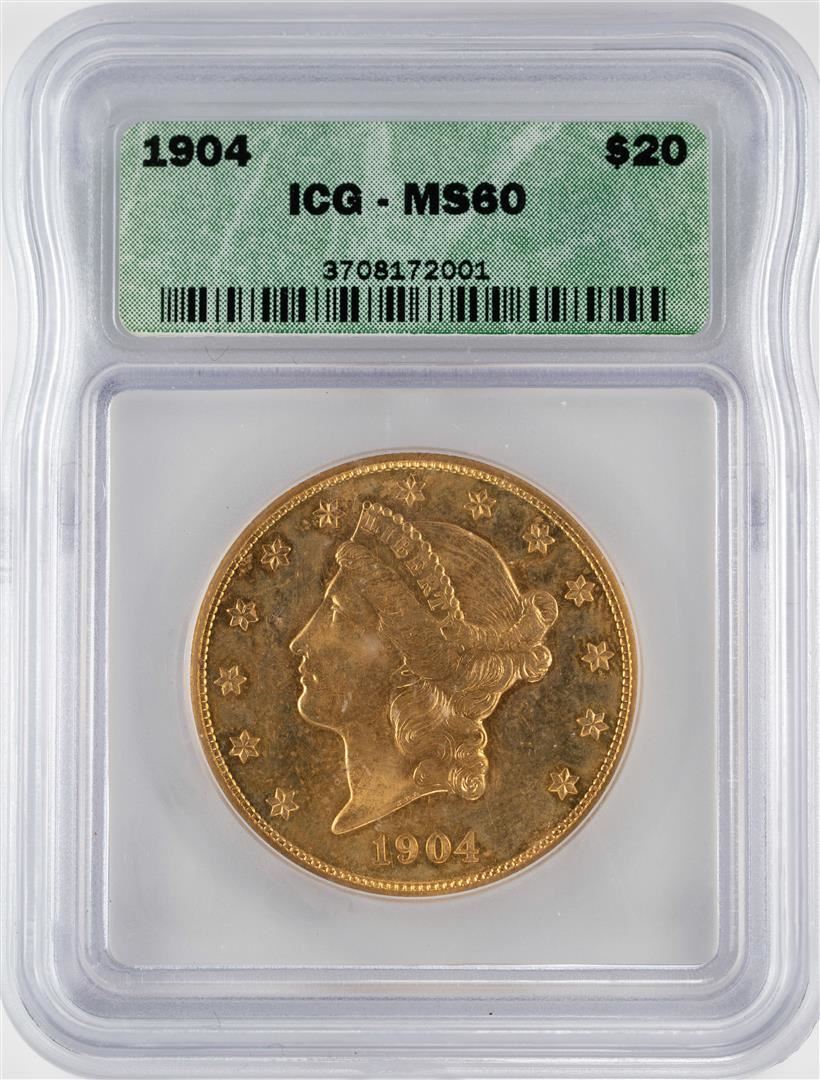 One 1904 $20 Liberty Head Double Eagle Gold Coin ICG MS60. ICG Certified.