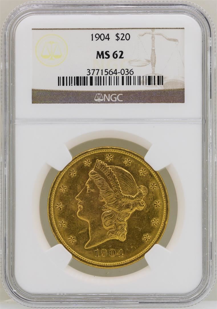 One 1904 $20 Liberty Head Double Eagle Gold Coin NGC MS62. NGC Certified.