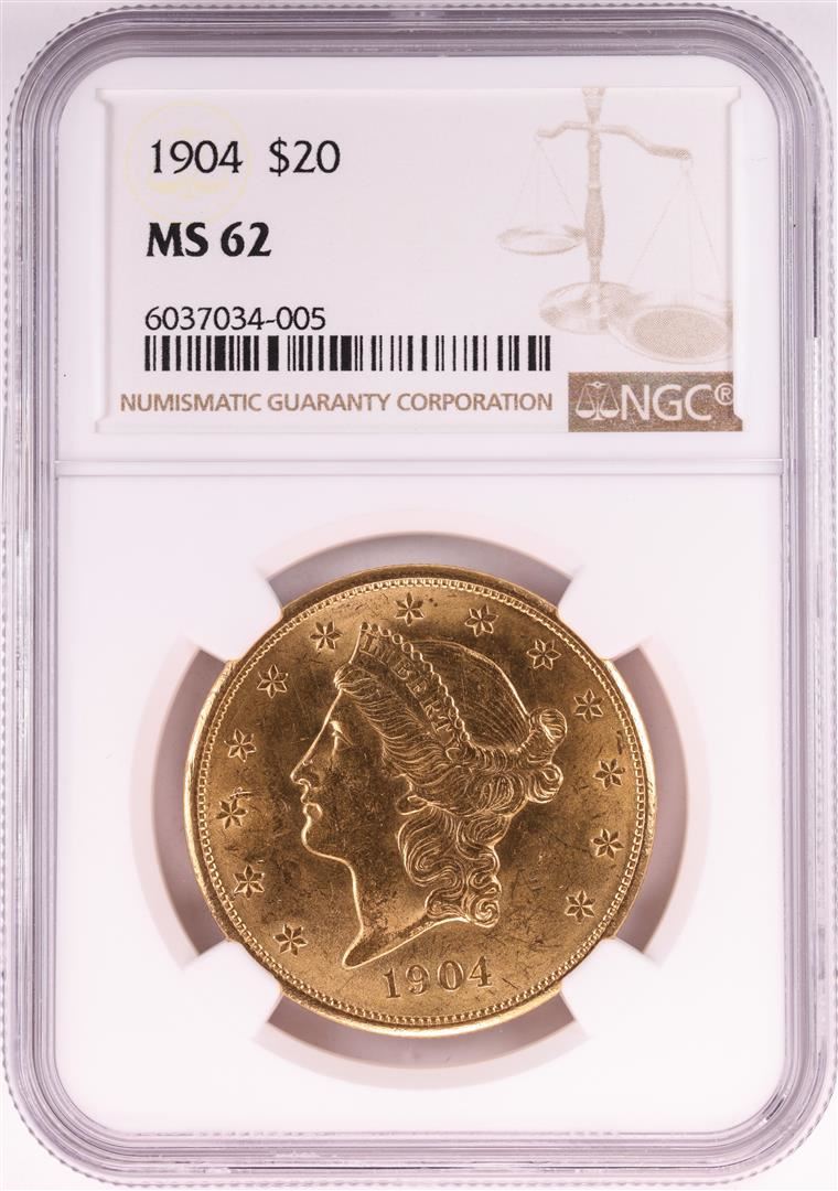 One 1904 $20 Liberty Head Double Eagle Gold Coin NGC MS62. NGC Certified.
