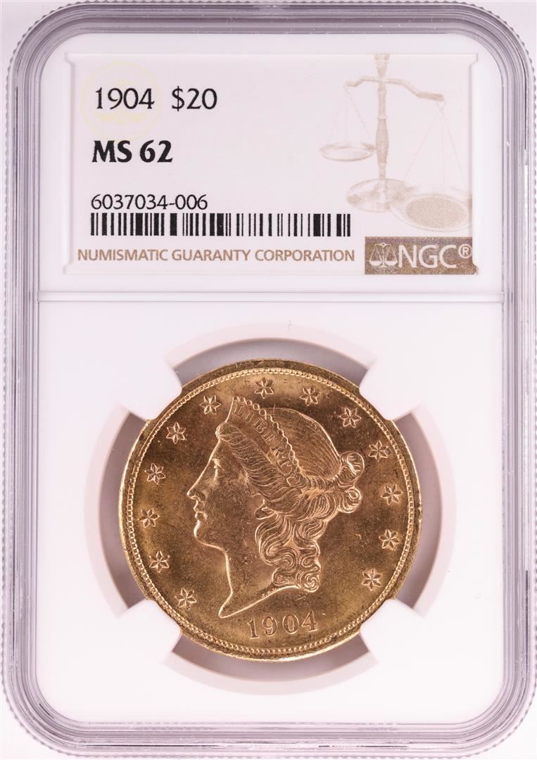 One 1904 $20 Liberty Head Double Eagle Gold Coin NGC MS62. NGC Certified.