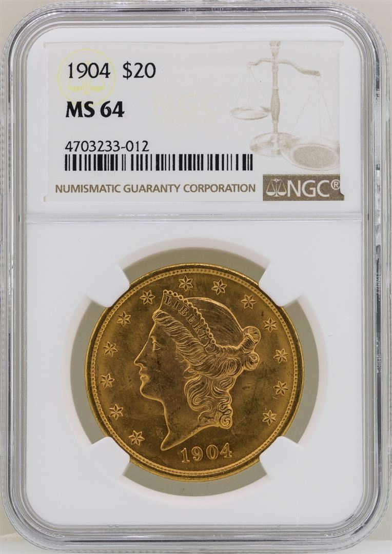 One 1904 $20 Liberty Head Double Eagle Gold Coin NGC MS64. NGC Certified.
