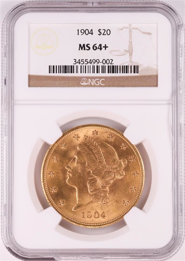 One 1904 $20 Liberty Head Double Eagle Gold Coin NGC MS64+, please note that the plastic on this slab has been chipped. NGC Certified.