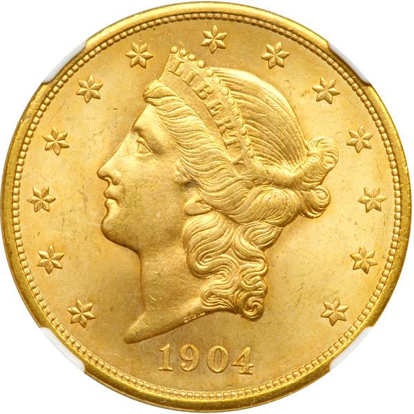 1904 $20 Liberty. NGC graded MS-66. Lovely rich golden toning. With a high mintage in 1904 and a good rate of survival, this issue is plentiful in terms of total number of BU coins known. Gems are scarce, however, with those in MS-66 always commanding attention.